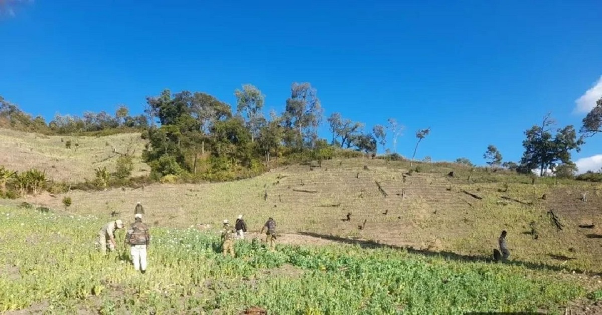 A combined team of security forces, forest department along with executive magistrate yesterday destroyed about 40 acres of poppy field at Ngatan Hill Range, Senapati-PS, Senapati district. Eleven makeshift huts, fertilizers and salt, pipes for irrigation, spray pumps etc. found at the site were also destroyed.