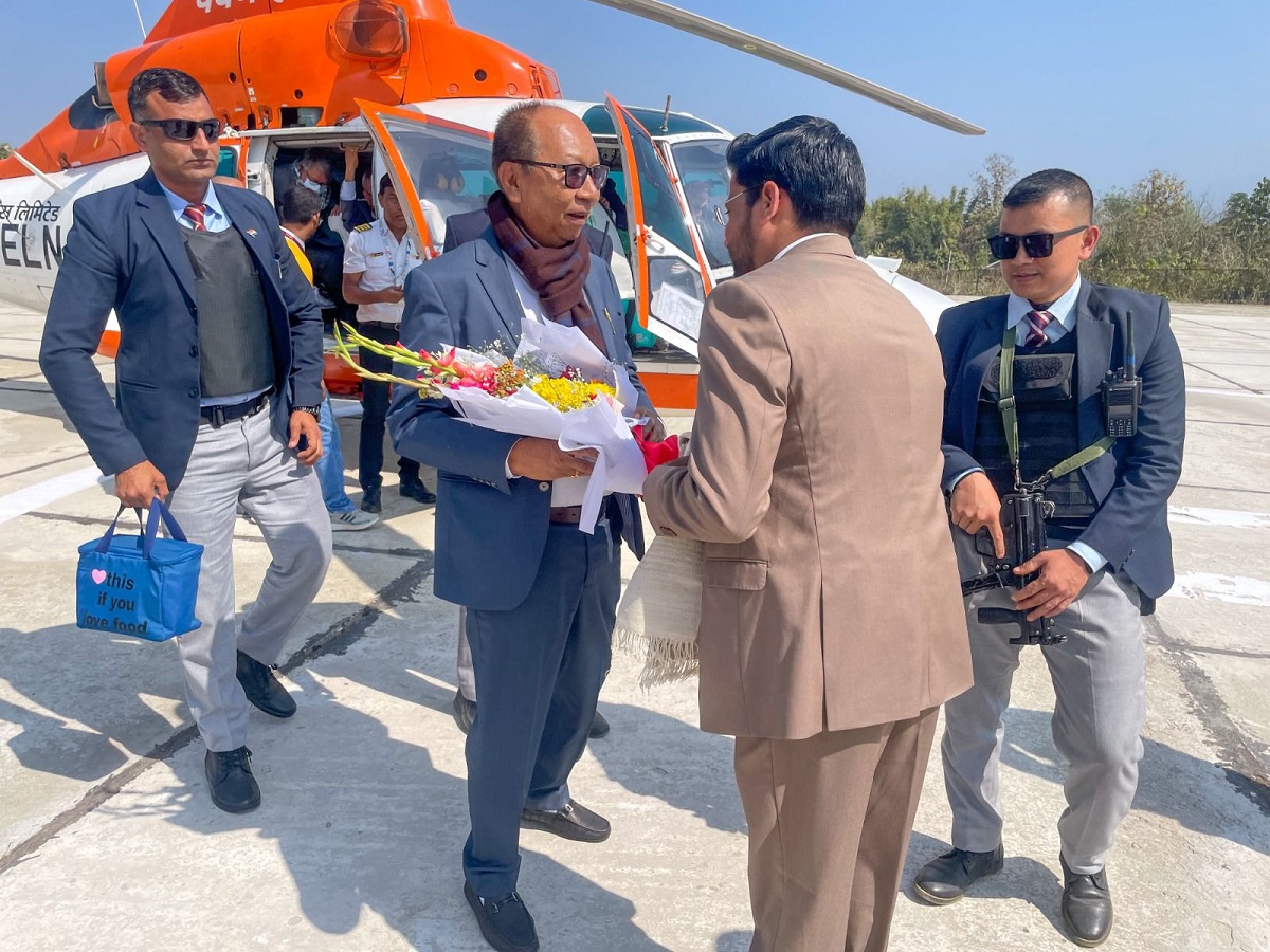 Yumnam Khemchand left for Jiribam from Kangla Helipad at 10 a.m. On his arrival at Bidyanagar Helipad, he was warmly received by the District Administration, led by Deputy Commissioner, Jiribam Krishna Kumar along with Superintendent of Police Prakhar Pandey, ADC, Jiribam Th. Manoranjan Singh and other officials from the District Administration, District Police and Central Security Forces.