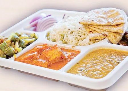 A typical vegetarian meal includes roti, vegetables (onion, tomato, potato), rice, dal, curd and salad. In the non-vegetarian version, broiler chicken is used instead of lentils. Despite fluctuations in commodity prices, the ratio of ingredients used to calculate these prices remains constant.