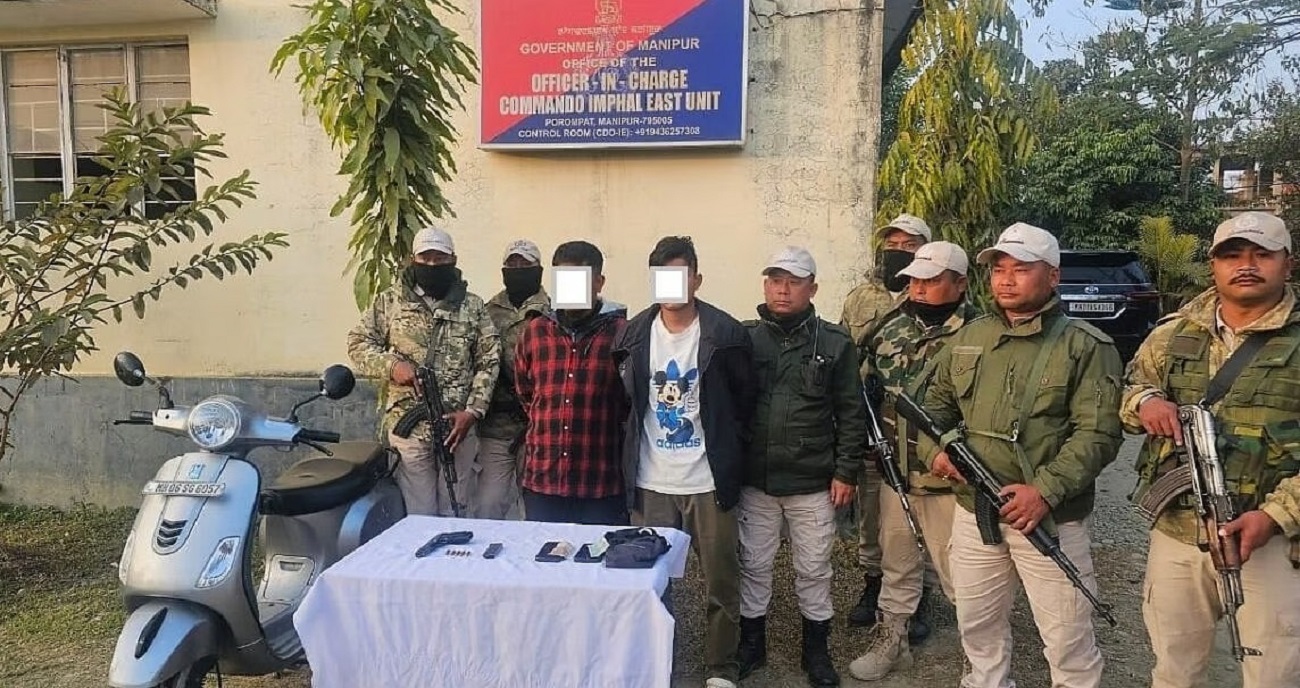 Four active militants from various underground groups engaged in extortion activities throughout the state were taken into custody by the Manipur Police on Tuesday. Two KCP(PWG) group members, Sorokhaibam Amarjit Singh (28), and Ningthoujam Jupiter Singh (27), were arrested at Mahabali by the Porompat Police Station in Imphal East. In the Greater Imphal region, they were allegedly extorting money from state servants, business owners, and members of the public. Five live bullets and a loaded M20 pistol were found in their possession by the police.