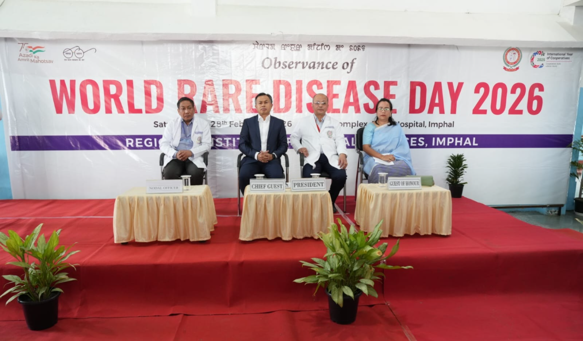 The Regional Institute of Medical Sciences (RIMS), Imphal, celebrated World Rare Disease Day 2026 with a program held at the OPD Complex, aimed at raising awareness of rare diseases, enhancing early diagnosis, and reinforcing support for affected patients and their families. The event featured notable personalities, including Prof. G. Sunil Kumar Sharma, the director of RIMS Imphal, who served as the chief guest, and Prof. S. Subhaschandra Singh, Medical Superintendent and Head of the Department of Radiodiagnosis, who presided over the ceremony. Dr. N. Shugeta Devi, Nodal Officer for Rare Diseases from the State Health Service, Government of Manipur, and Prof. Ch. Shyamsunder, Head of the Department of Pediatrics and Nodal Officer of the Rare Diseases Committee at RIMS, were also among the Guests of Honor.