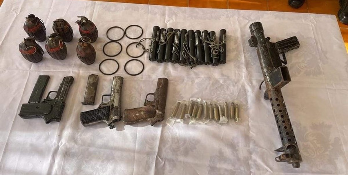 During search operations in Leimaram, Bishnupur District, the security personnel found one cache of weapons. It included an SLR with a magazine, a.303 rifle, two live rounds of ammunition, seven HE-36 grenades, two tube launchers, a grenade arming ring, a walkie-talkie set with a charger, two stun grenades (tear smoke), and other random items.