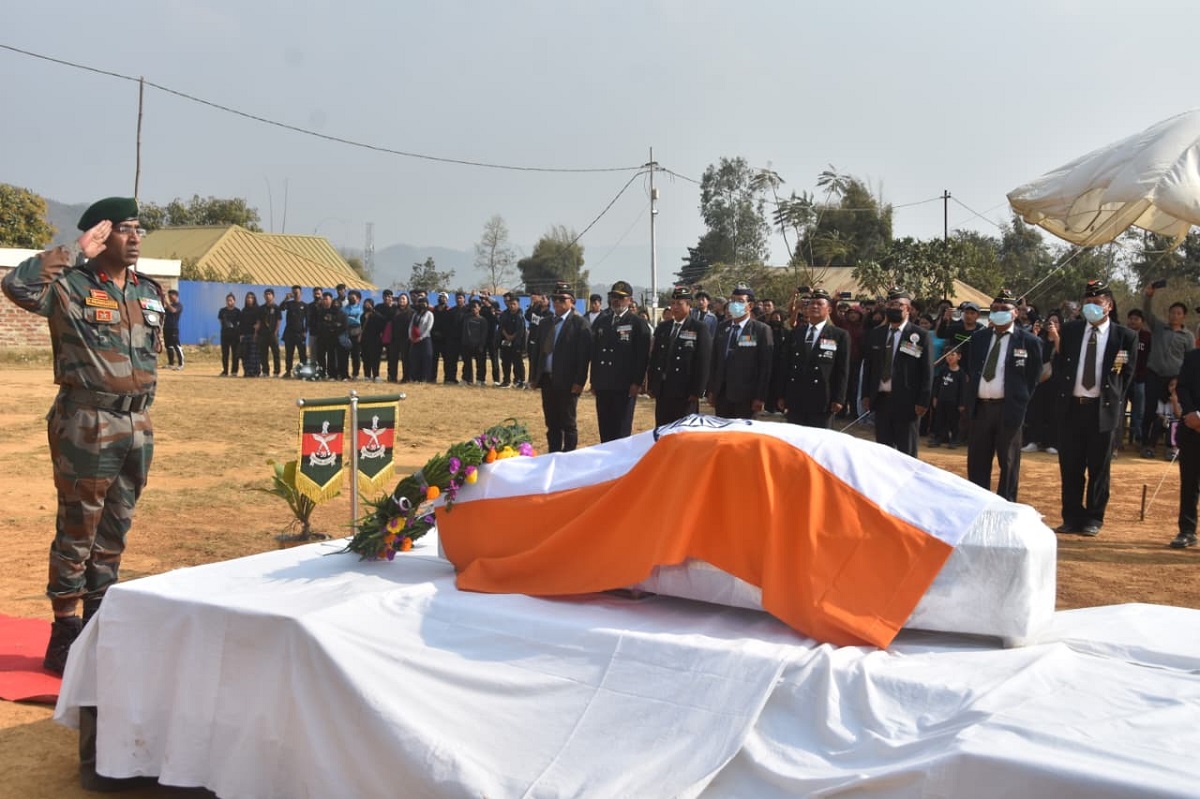 A solemn military funeral with full honours was held for Braveheart Agniveer John Ginlallen Haokip of the Assam Regiment Centre, recognizing his supreme sacrifice in the line of duty. Conducted with meticulous precision, the ceremony reflected the soldier’s courage and commitment. The wreath-laying was led by the Inspector General of Assam Rifles (South) along with the Sector Commander, who placed wreaths on behalf of the General Officer Commanding, 3 Corps. This event saw participation from senior military officials, civil administration representatives, veterans, and a large crowd of local citizens, all joining the troops to pay tribute.